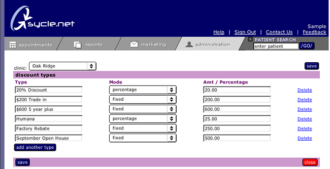 Discount types appear in pull downs on the purchase page. A discount can be listed as either a fixed amount or a percentage. You can have as many discount types as you wish.