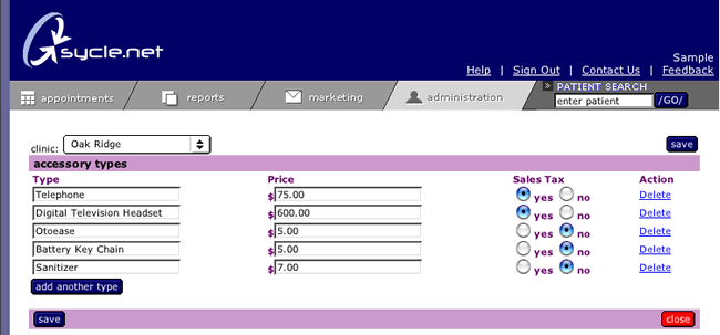 Many clinics offer a limited assortment of ALDs and other related items. You can add any items you offer. You always have the opportunity to add other items "on the fly" as you're making a purchase, even if the items aren't listed here.