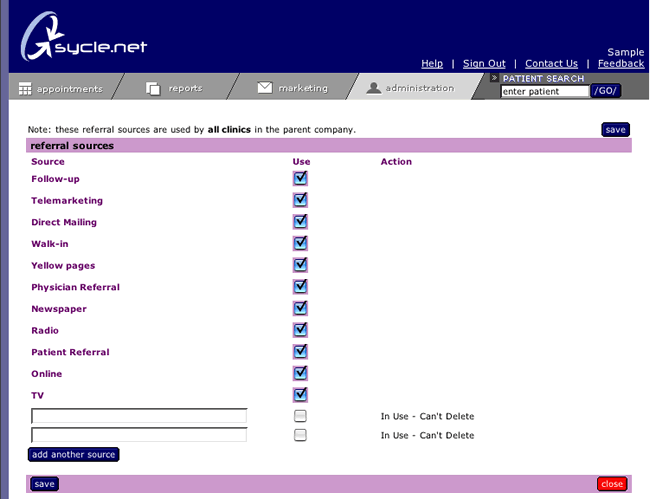 Sycle provides eleven standard referral sources. You can turn off any that are not applicable to your practice. You can also add as many as you wish.