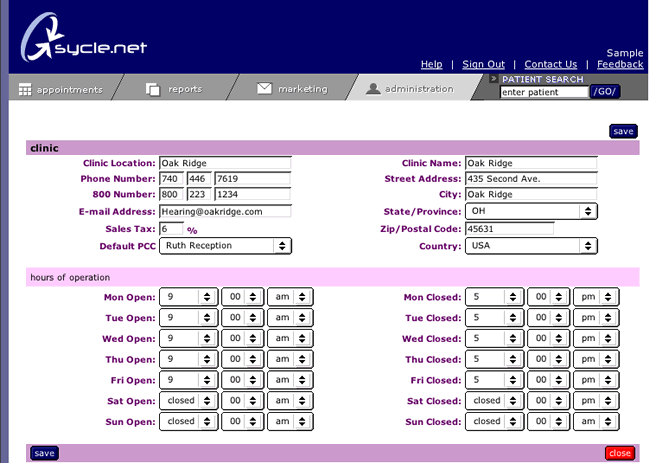 The clinic information is important. The address listed here will be printed on all direct marketing pieces that come from your clinic. The selected sales tax amount will be used for calculating sales tax when applicable.