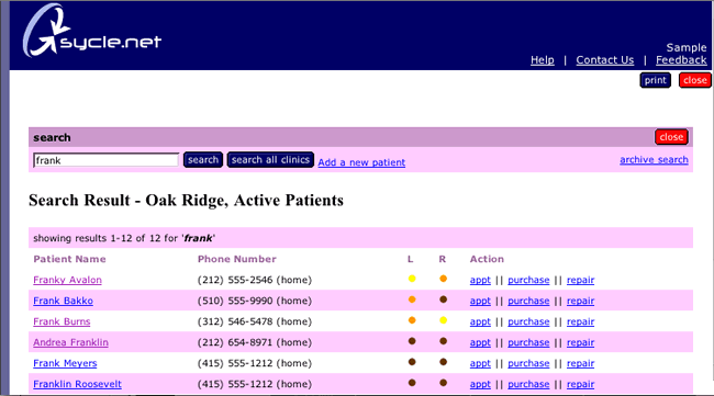 Once you've located your patient, click on their name to access complete patient records or click on any of the following three actions: "appointment", "purchase" or "repair". Please note the color-coded dots that correspond to the patient�s battery size. |