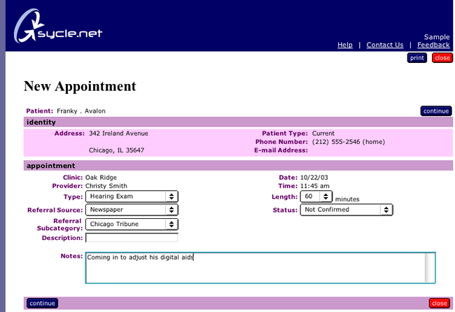 Next, select the type of appointment, the referral sources, add any notes that you might have and click "continue". (The appointment length will default to the length you specified in the admin section.)