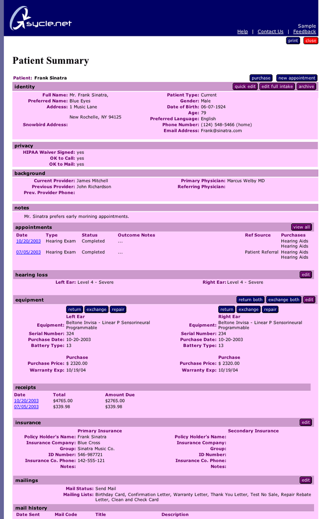 Using the patient search, the "patient summary" is one click away. The patient summary maintains complete patient records, including all past and future appointments, as well as current and back-up equipment.