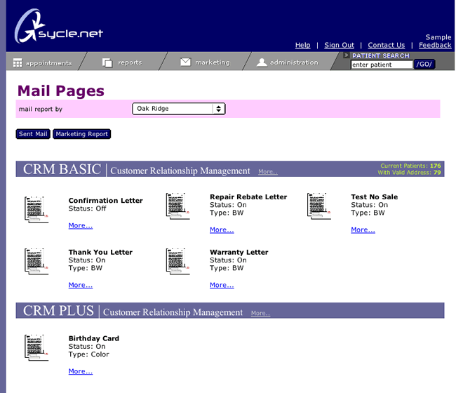 Sycle automatically creates and sends mail for you using a bonded mail house. This feature is completely optional. Each piece of mail is event driven. For example, if you sell a hearing aid, a thank you letter will be sent to your patient the very next day. It will be printed with your logo and come from your office—and more specifically, it will come from the patients' dispenser or audiologist. Birthday cards are sent one week prior to a patient's birthday.