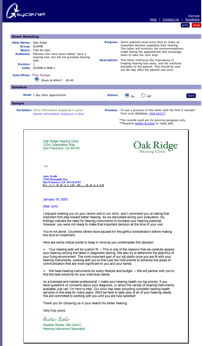 The tested-not-sold letter is programmed to go solely to patients who have a hearing loss but do not make a purchase. It's a nice follow-up letter and often just what the patient needs to help them make the decision to buy.