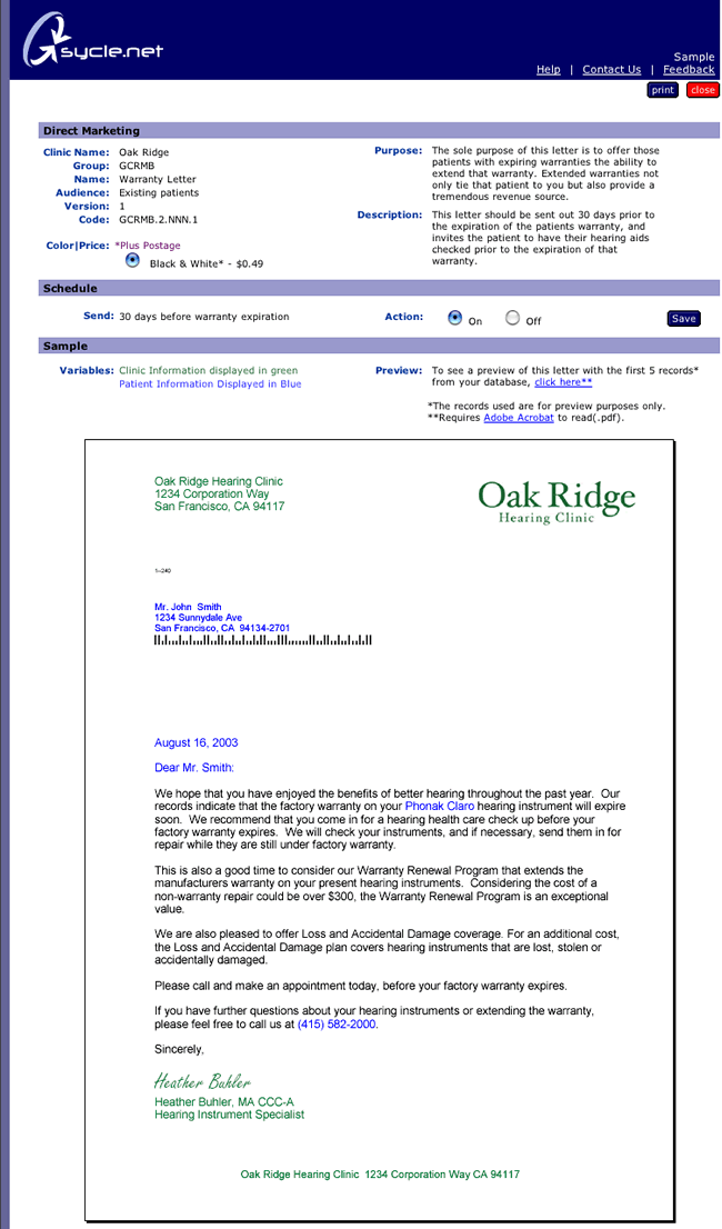 The warranty letter goes out to patients 30 days before their warranty is due to expire. This letter encourages them to visit your clinic before the manufacturers warranty expires to make sure their hearing aids are working properly. This creates and opportunity to offer them an extended warranty or to upgrade their older equipment. |