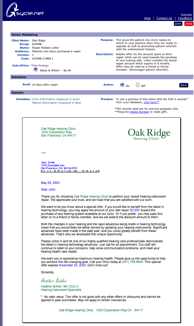 The repair rebate letter inserts the exact amount of your patient's recent repair directly into the letter and offers them the opportunity to put that amount towards the purchase of new hearing aids. Customers appreciate knowing the repair money is not "wasted". This letter has been highly effective in creating hearing aids sales. |
