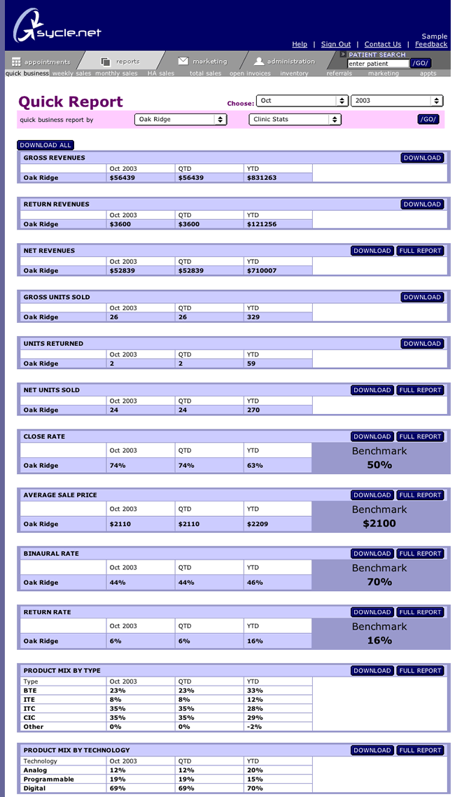 The landing page for the reports area is the Quick Business Report, designed to give you a quick and up-to-the-minute snap shot of your practice. This report includes gross and net units as well as binaural rates, average selling price, return rate and more.