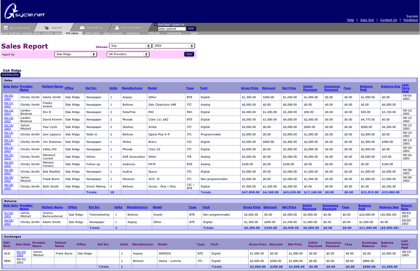 The Hearing aid Sales report consolidates sales by provider, deposits, payments, discounts and more. This report also downloads to excel which is a great way to calculate employee commissions.