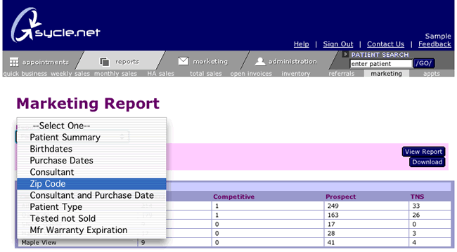 The Marketing Report allows you to create marketing lists based on criteria that you choose from the pull down. For example you could download all of your "tested not sold" patients and send them a special offer. Each of these reports download directly to your desktop in Excel ready to take to your local mail house. |