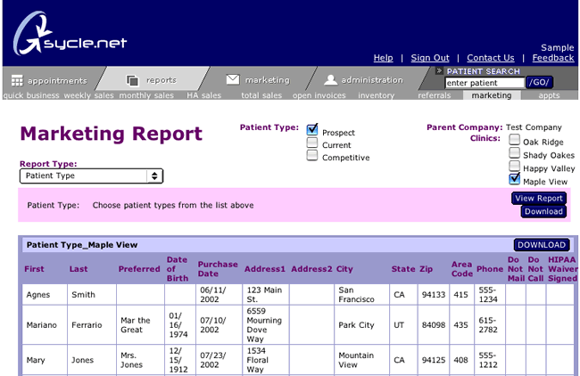 In this example we are about to download the "prospects" for the Maple View Clinic.